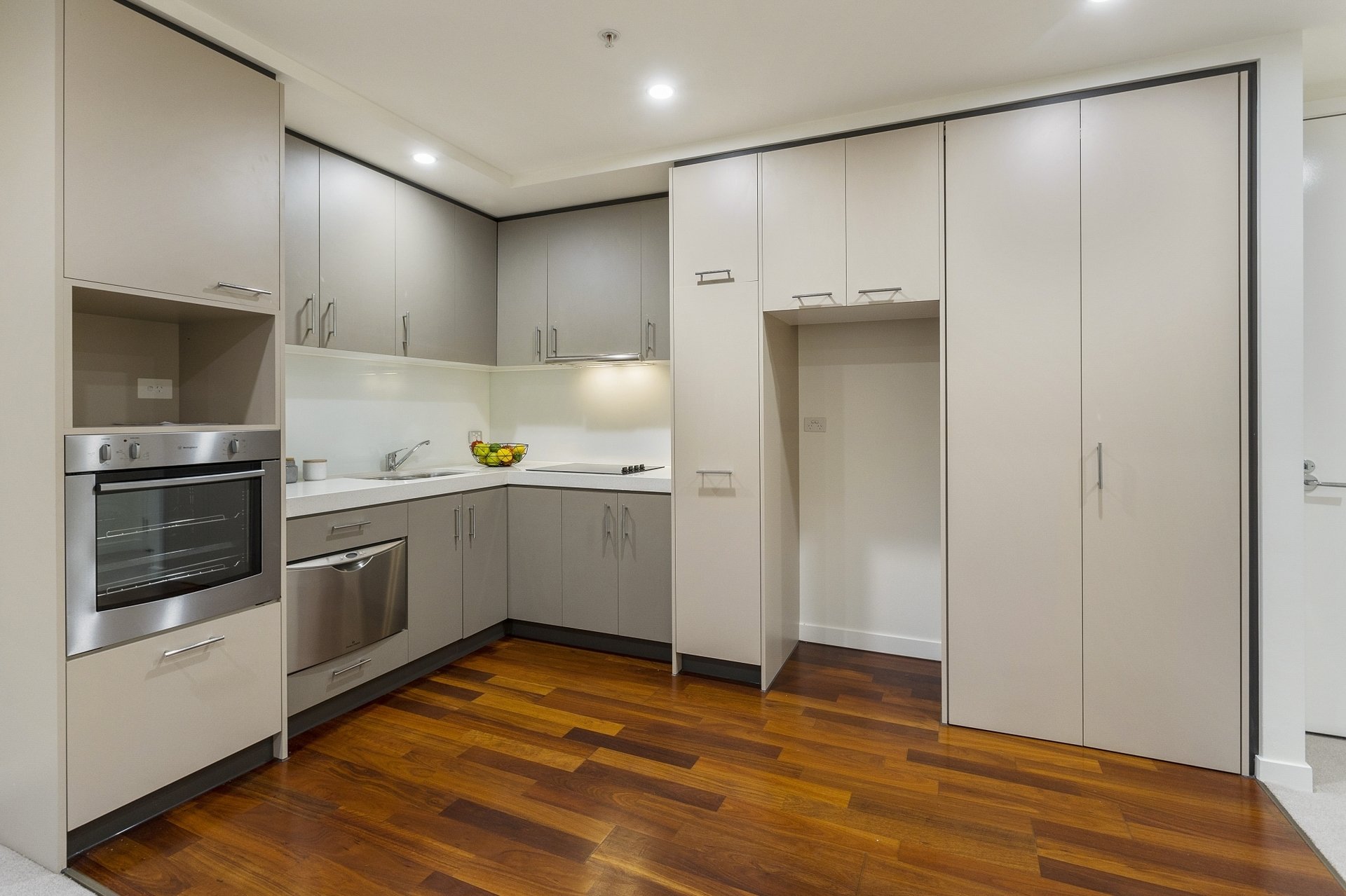 • Modern kitchen with stone benchtops and stainless-steel appliances