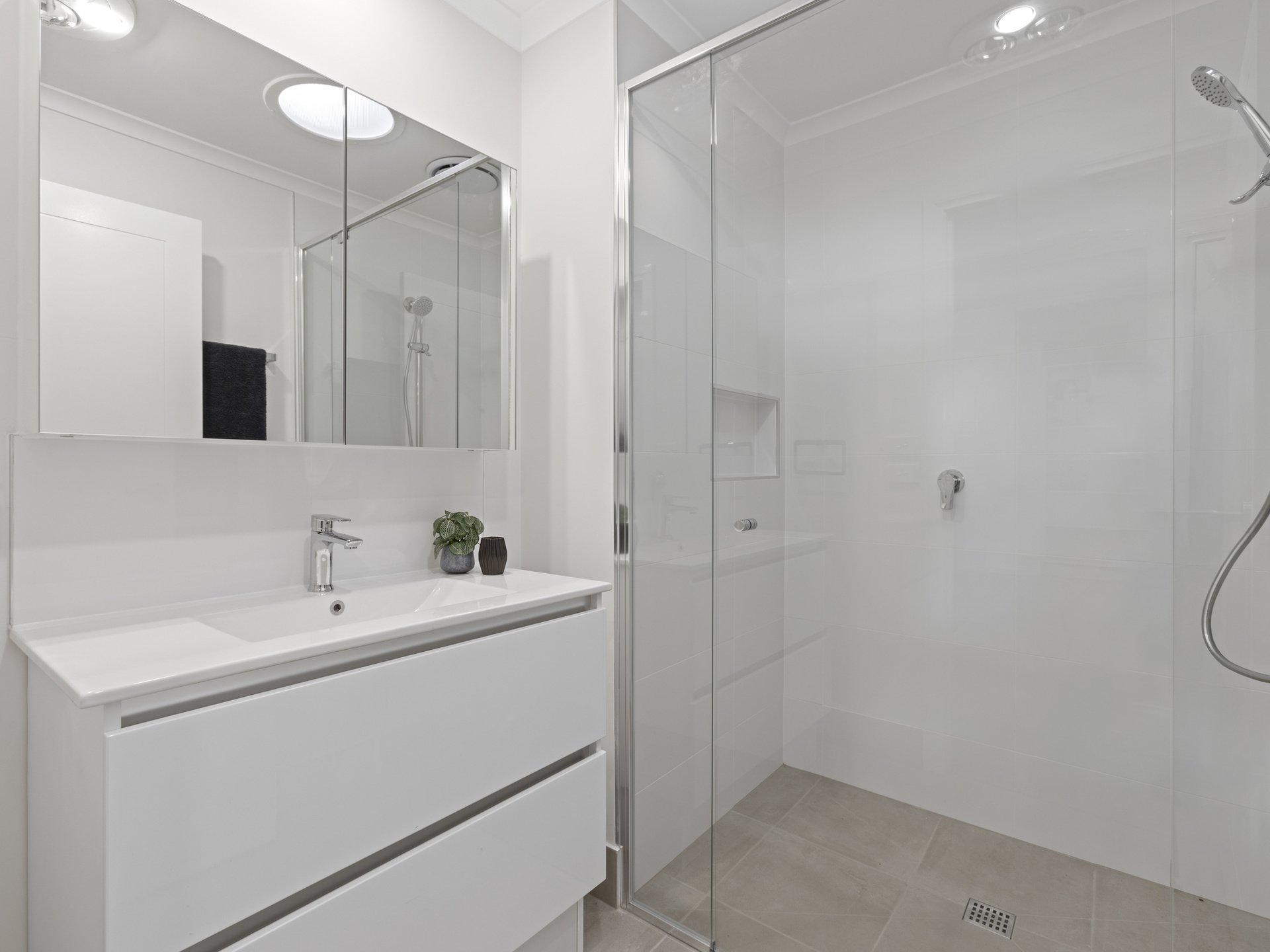 • Sleek bathroom with walk-in shower and contemporary vanity