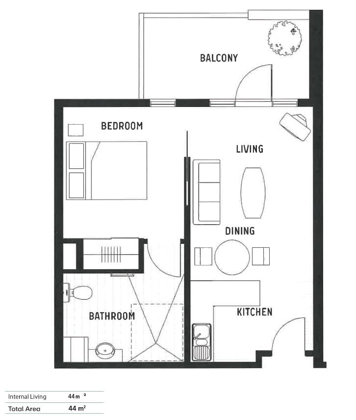 • Sleek kitchenette with stone benchtops and ample storage