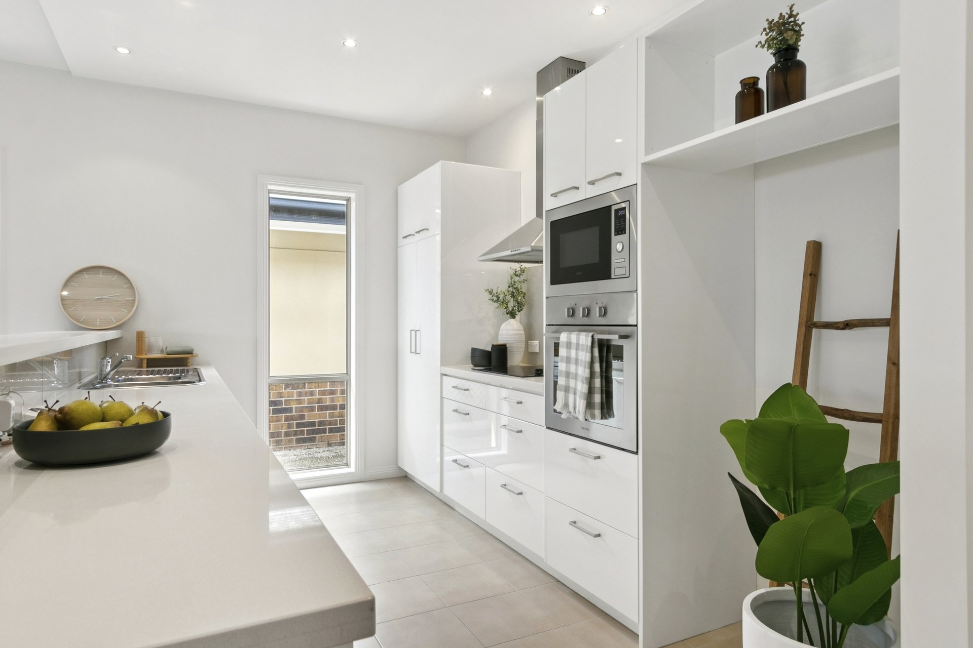 • Sleek kitchen with stone benchtops and stainless-steel appliances