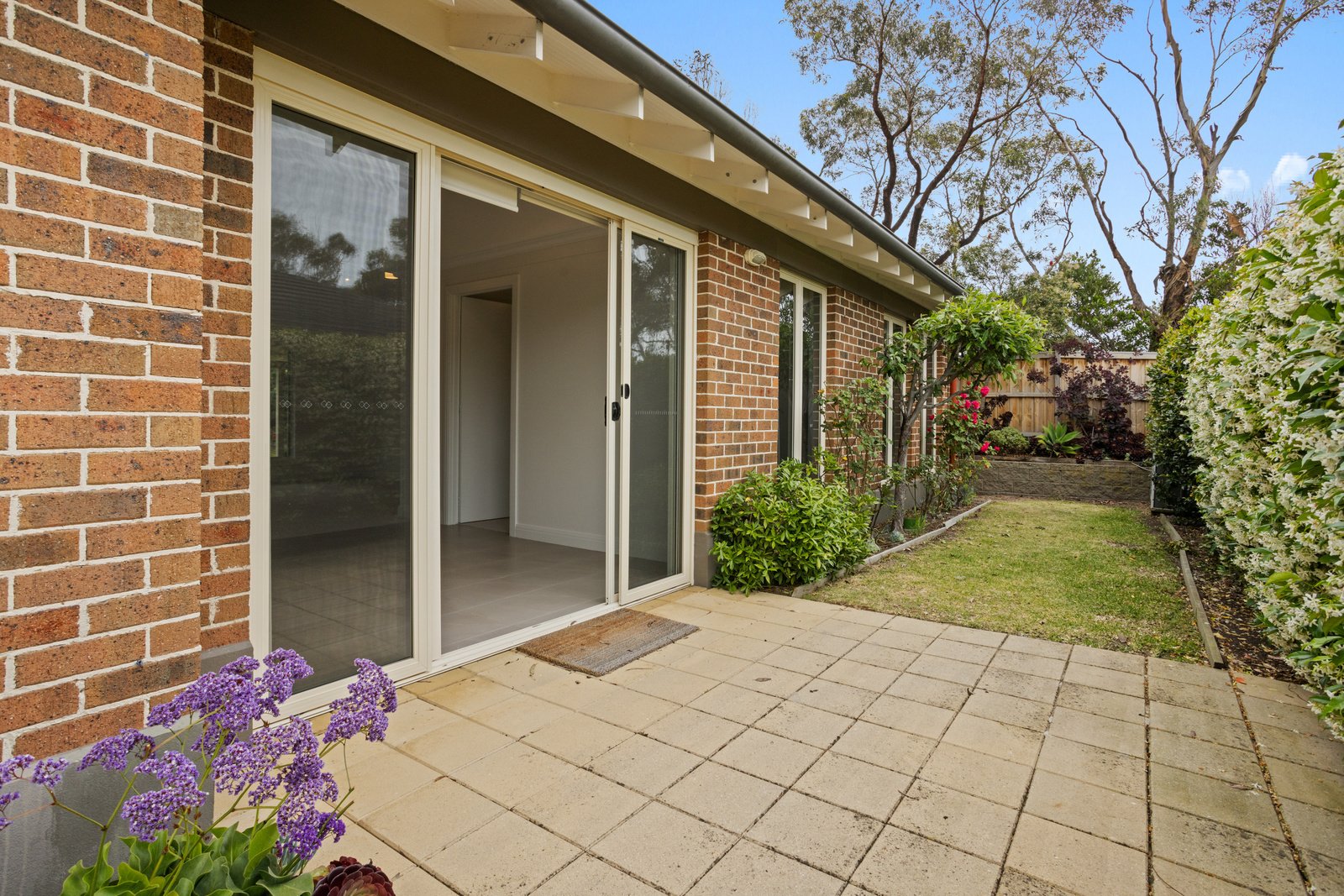 • North-facing courtyard framed by greenery